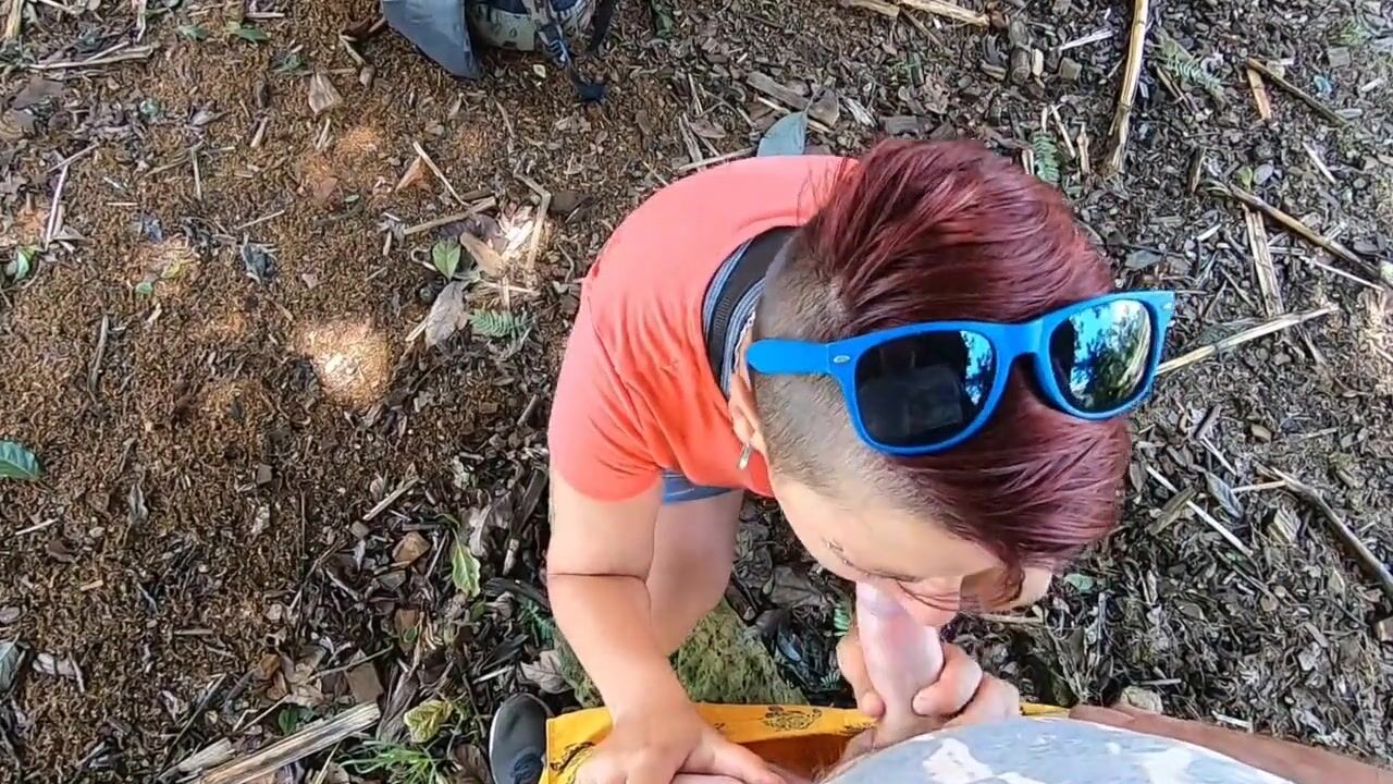 A passionate couple enjoys an intimate moment in nature, with a quick, steamy blowjob session in an abandoned house. She eagerly satisfies her man, licking and sucking, ending with a mouthful of his cum, which she happily swallows.