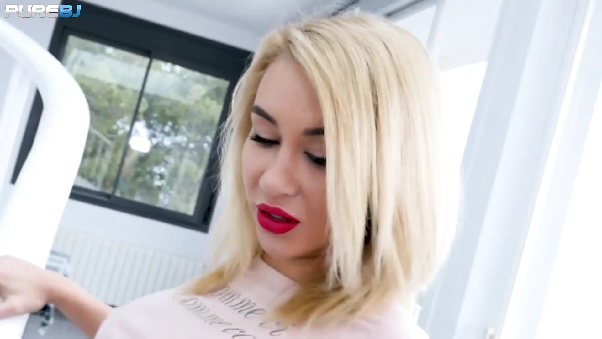 This blonde beauty is right emerging in front of your eyes. This chick’s face is so pretty and she is wearing her skimpy outfit. Katrin also got that lipstick applied on her gorgeous lips and it is very noticeable. You can see her full beauty with that makeup of hers but the best thing that you will see is how she presents herself in front of the camera. She knows how to tease and present her sexy body as well as her tits and her butt. She also got those long legs especially her right one as she got those amazing tattoos that we always want to see. After Katrin naughtily smiles and starts at the camera she started to remove her top. She revealed those perfect fake tits on its perfect size for her sexy figure. She also shows her red thong as she reveals her nicely shaped butt. This Russian blonde got some goodies and she teases on the floor, bending over her body, highlighting her sexiness. She paused for a quick chat, introduced herself and said s