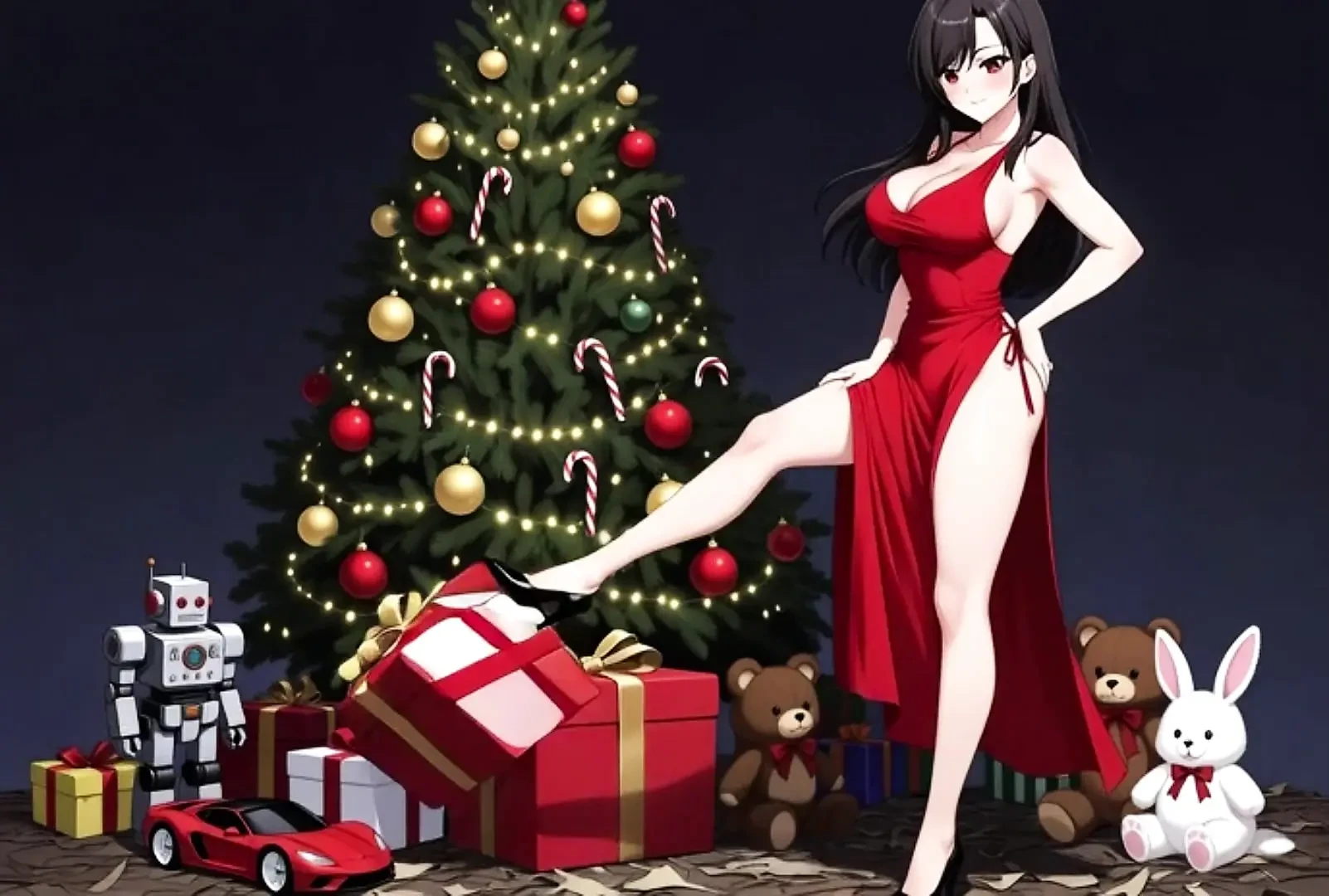 Fantasy video featuring adult women interacting with and crushing Christmas toys in a creative and visually stunning setting. Completely fictional and simulated content. Only toys and props are used. No real harm of any kind occurs.