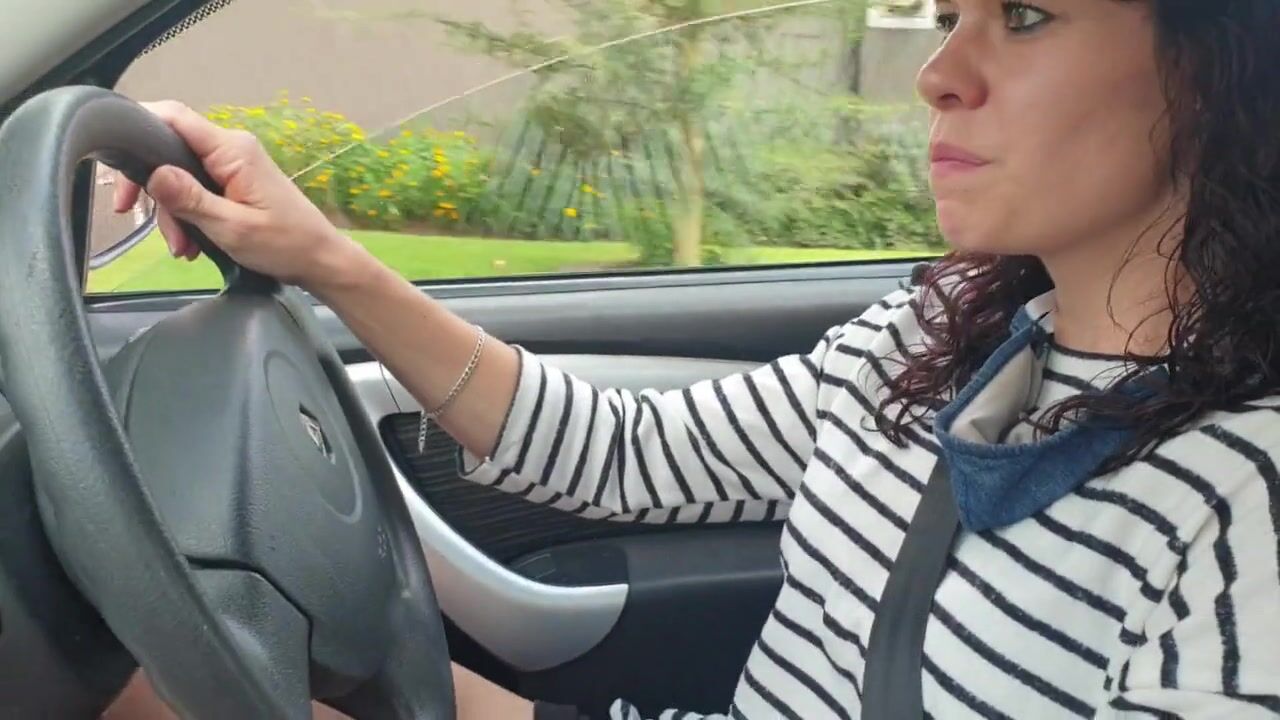 A naughty brunette MILF takes a drive in her car & can't resist playing with her petite pussy, fingering & rubbing herself, risking public exposure with a kinky solo masturbation session.