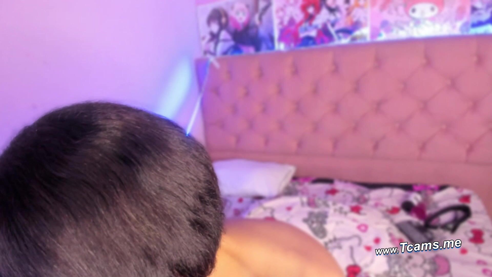 In a dimly lit bedroom bathed in soft purple LED glow, a confident trans woman with short black hair and bold red lipstick lies back on a floral-patterned bed, completely nude. Her legs are spread wide and pulled toward her chest, soles of her feet facing the camera in a teasing display. She holds a black dildo firmly in one hand, positioning it at her entrance as she prepares to penetrate herself, her smooth cock and balls visibly resting between her thighs. Her expression is playful yet intensely seductive, eyes locked on the viewer with a knowing smirk, inviting you to watch as she pleasures herself in this intimate, explicit solo video performance.