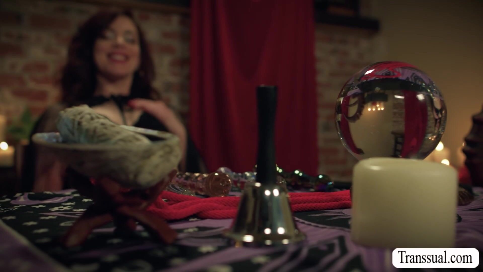 Busty witch summons two shemale and get fucked