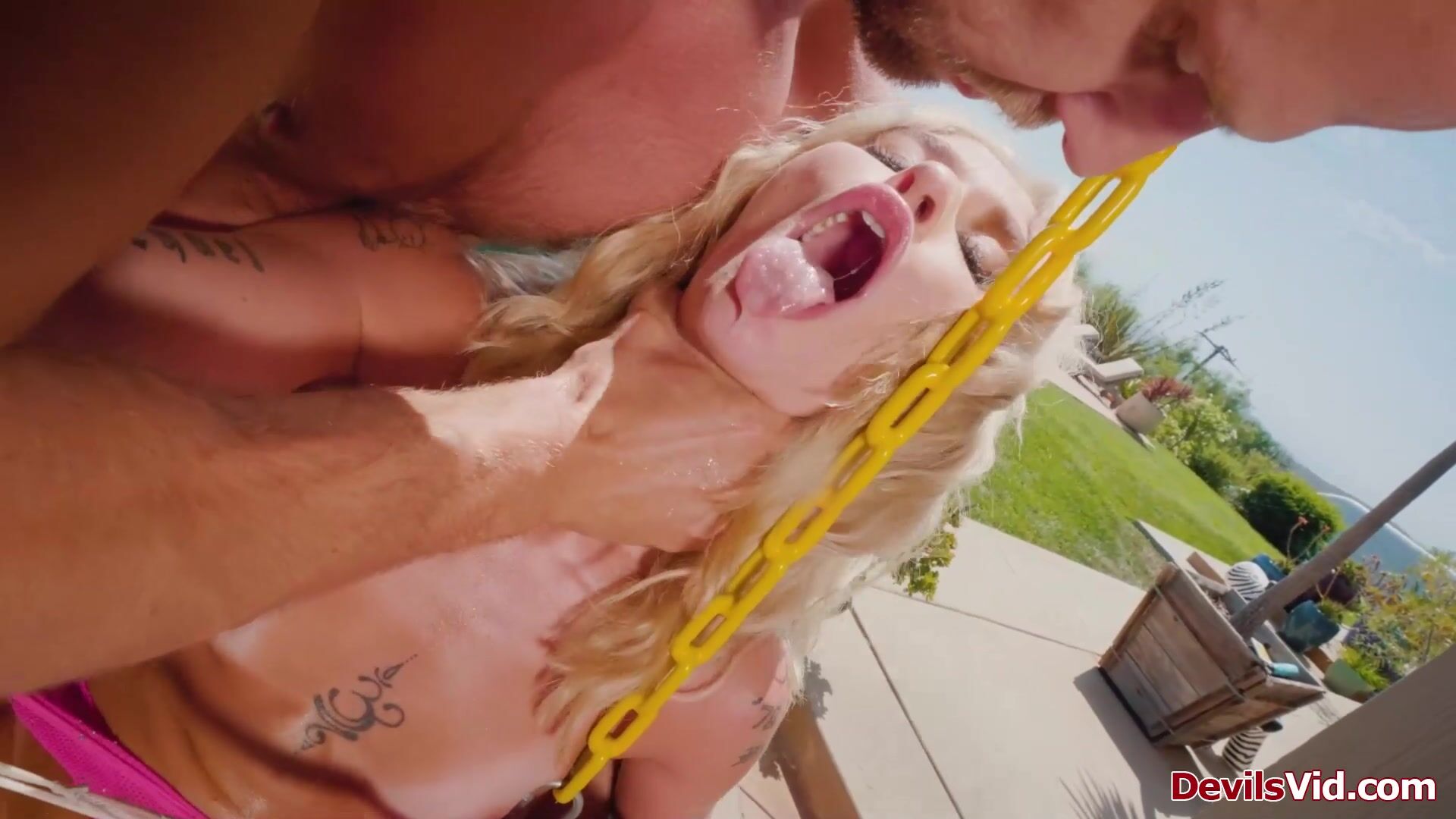 Blonde Emma Rosie is masturbating her shaved pussy in an outdoor swing.Her guy comes in fingering her cunt and makes her squirt.The small tits babe deepthroat his big cock,sucks his balls then rims his ass.The dude carries her while fucking her pussy
