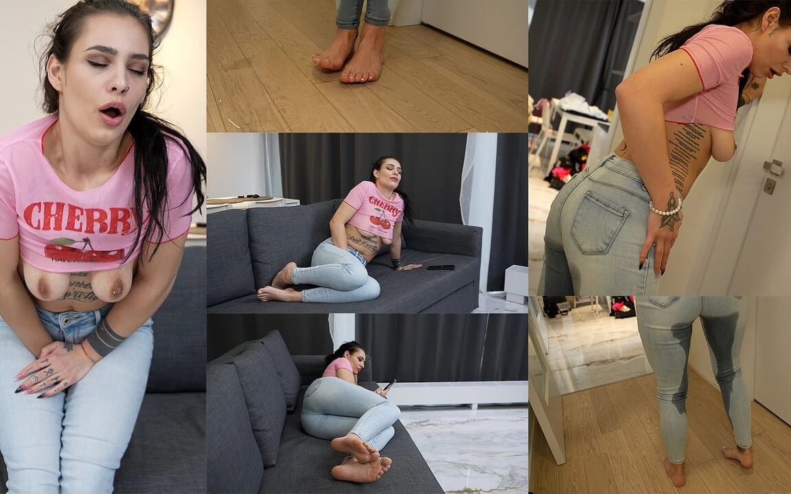 She loves to feel desperate because it gives her pleasure like no one else so she always choose to wait till the last moment before she pee, but this time she couldn't get inside the bathroom as it was occupied ... What else she could do then to let all her pee wet her tight jeans right next of the bathroom door!