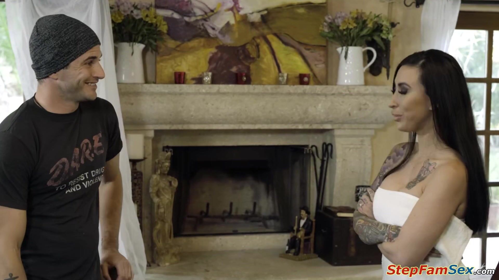 Stepson catches his busty tattooed stepmom Lily Lane masturbating and makes him move.The big tits milf is kissed and doggystyled.The horny stepmom deepthroats his cock and gets her pussy licked.The petite big boobs latina lets him anal fuck her ass