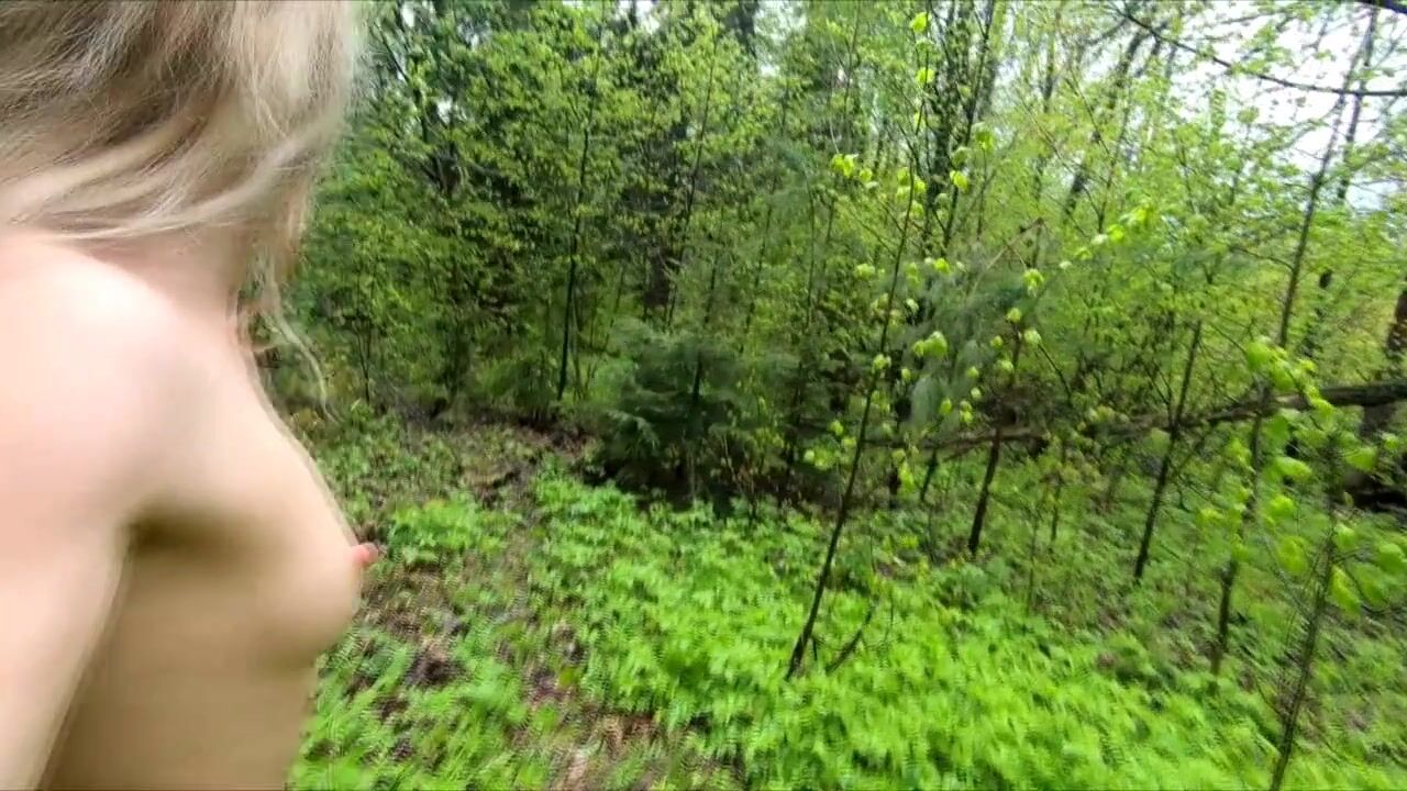 Risky public nudity adventure with a hot amateur exhibitionist flashing her big ass and tattoos in the forest, a solo female webcam show with a twist of BDSM and romance.