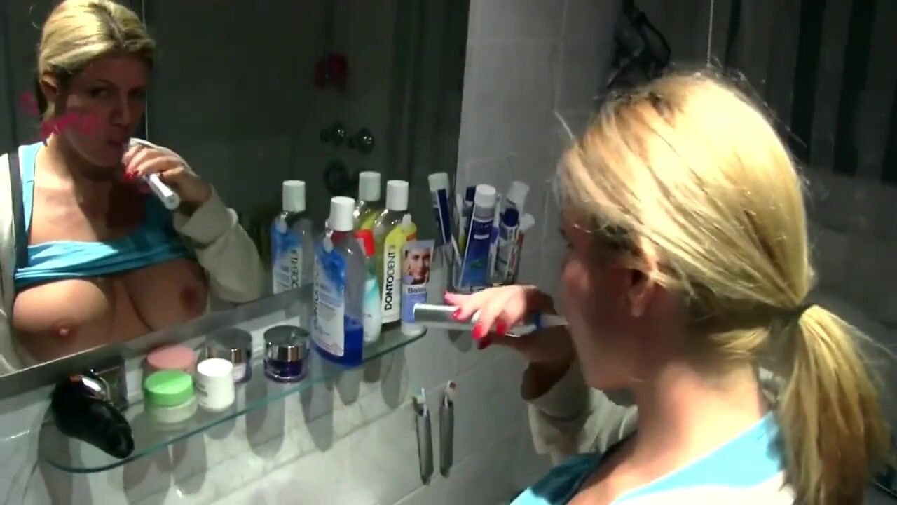A hot German amateur with big tits gives her husband a nice surprise in the bathroom. She teases and flaunts her sexy body, big boobs, and mature beauty, creating an intimate and arousing atmosphere.