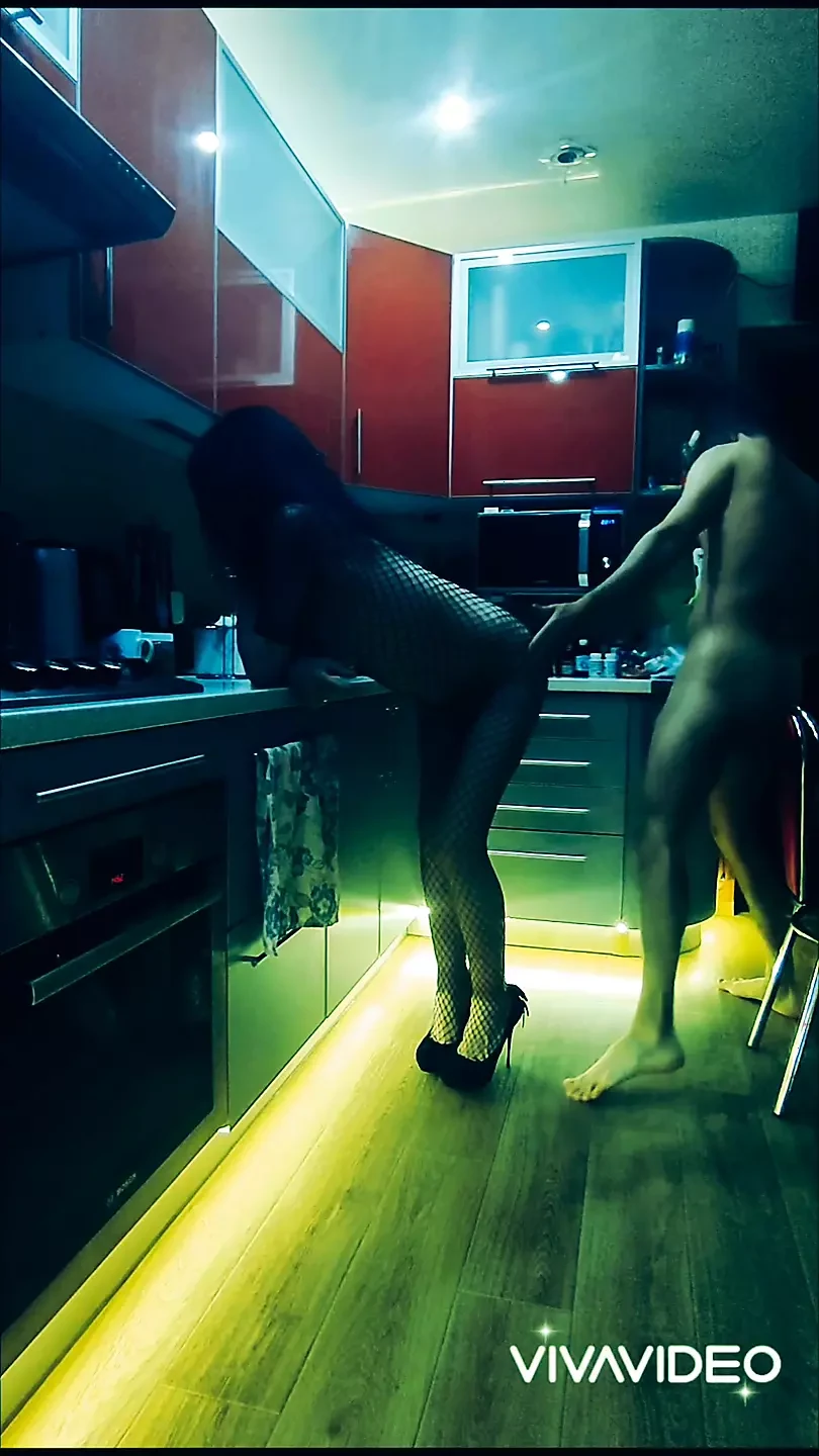 Beautiful slender wife in erotic bodysuit fucked in the kitchen in all positions