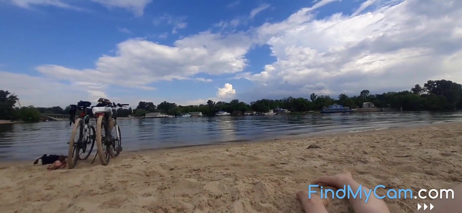 Solo brunette pleasures herself on a public beach.